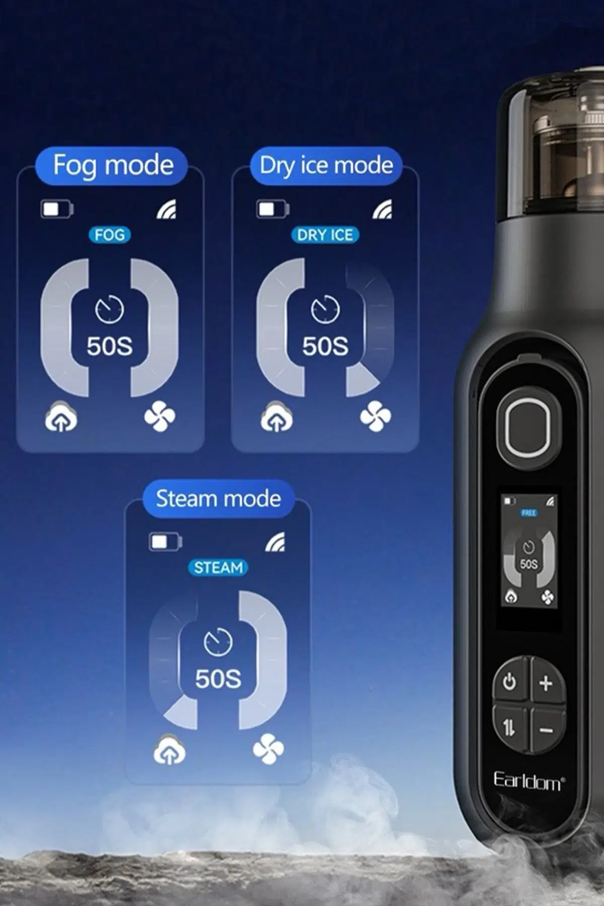 Her modda 50 saniyelik otomatik sis yayma döngüsü ile kontrolü tamamen size bırakır. Görsellerden takip edilebilen LED ekran göstergesi sayesinde mod ve kalan süre anlık izlenebilir.