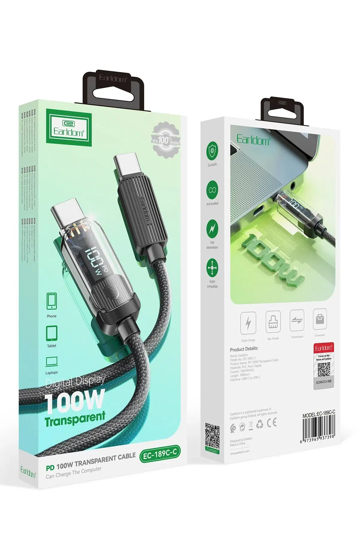 100W Güç Kapasitesi: Earldom EC-189CC, 100W’a kadar PD (Power Delivery) hızlı şarj desteği sağlar. Bu güç kapasitesi, dizüstü bilgisayarlar, tabletler ve akıllı telefonlar gibi yüksek güç gereksinimi olan cihazları hızla şarj etmenizi mümkün kılar.