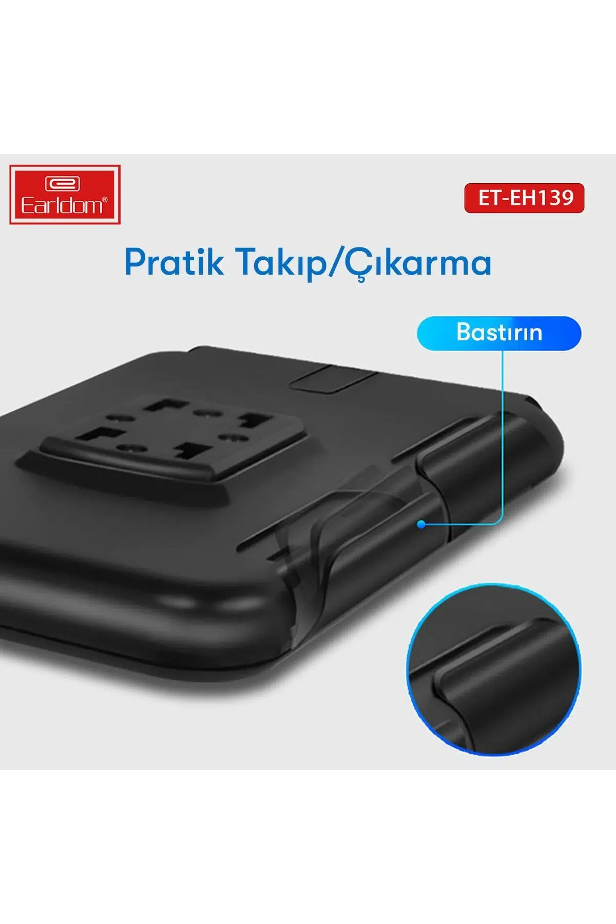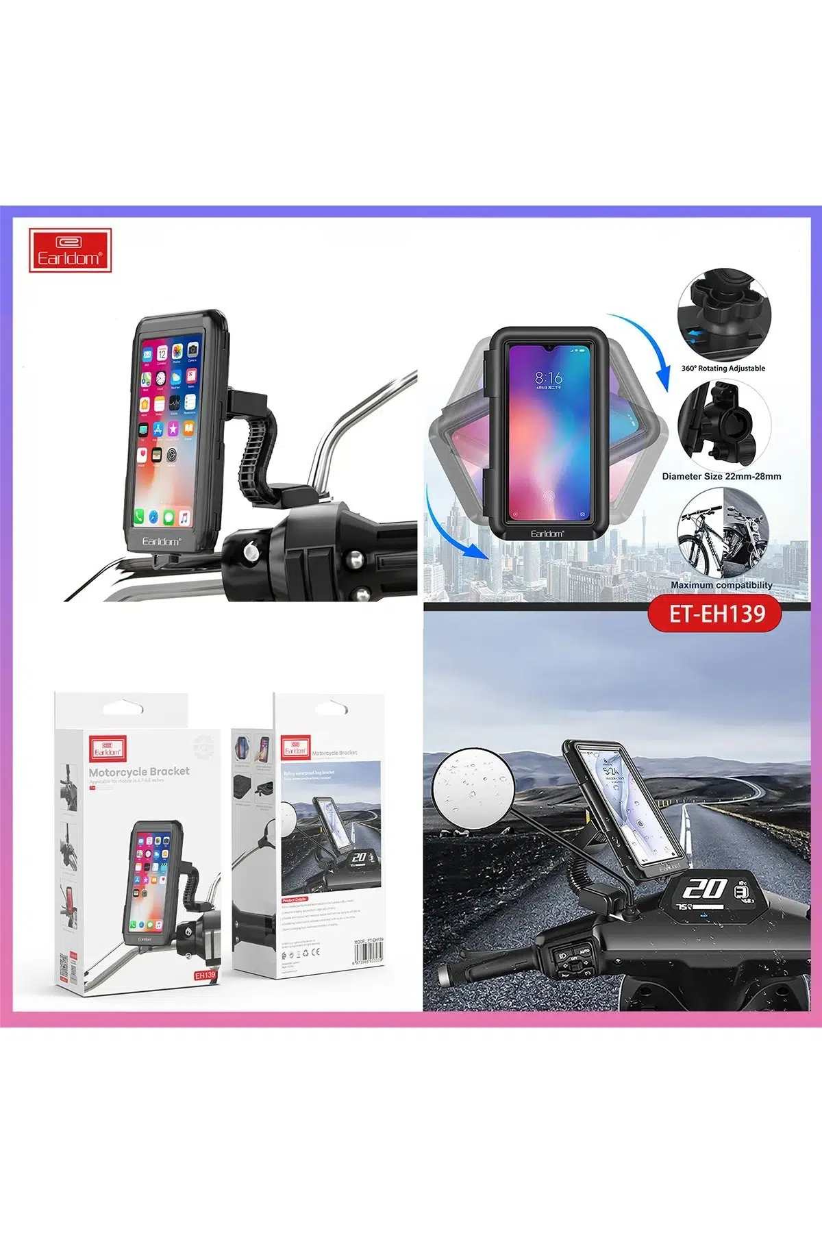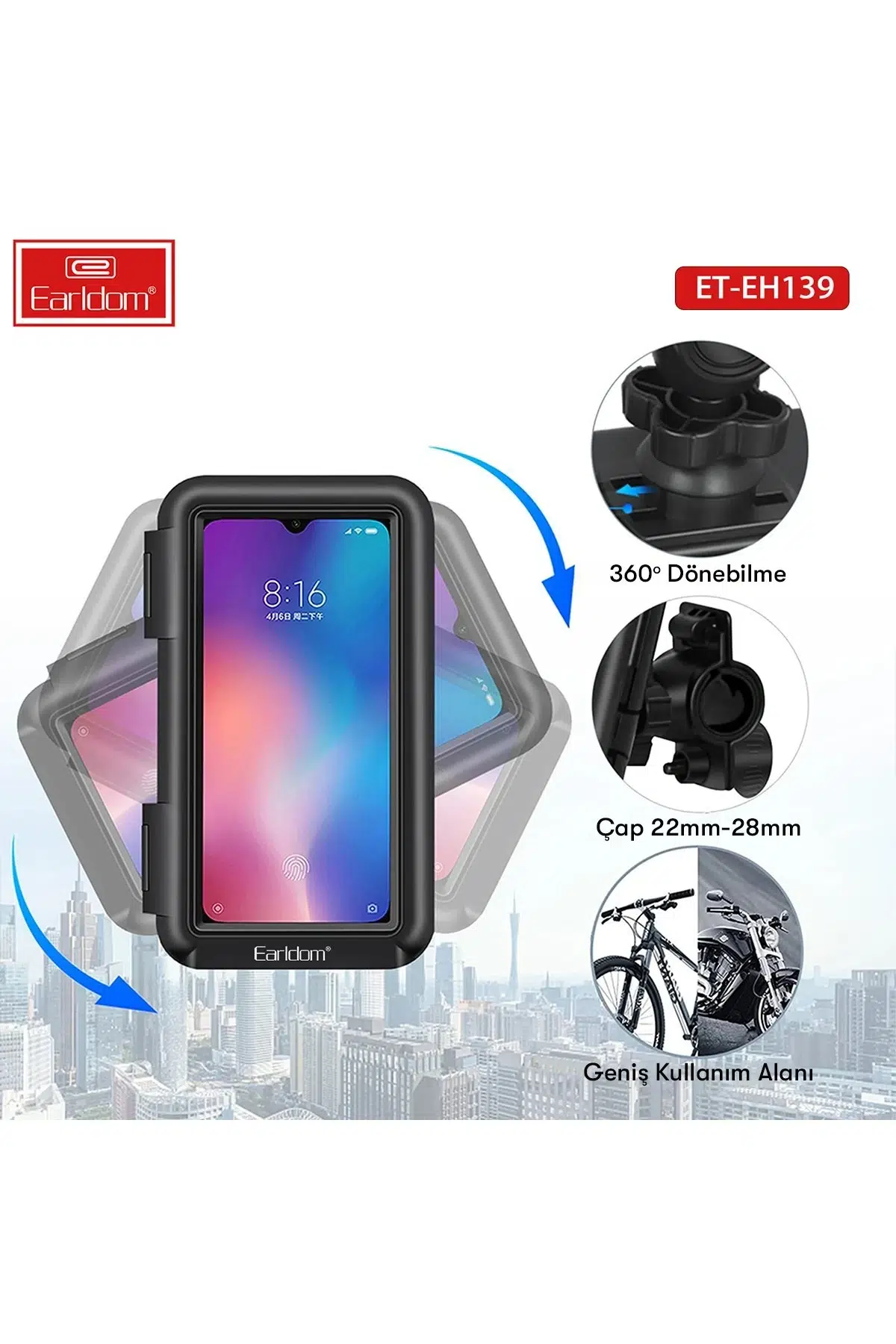 Earldom EH139, motosiklet ve bisiklet kullanıcıları için özel olarak tasarlanmış, su geçirmez, dayanıklı ve 360° dönebilen bir telefon tutucudur. Sürüş sırasında navigasyon kullanımı, çağrı cevaplama ve müzik kontrolü gibi işlemleri güvenli ve pratik bir şekilde yapmanıza olanak tanır.