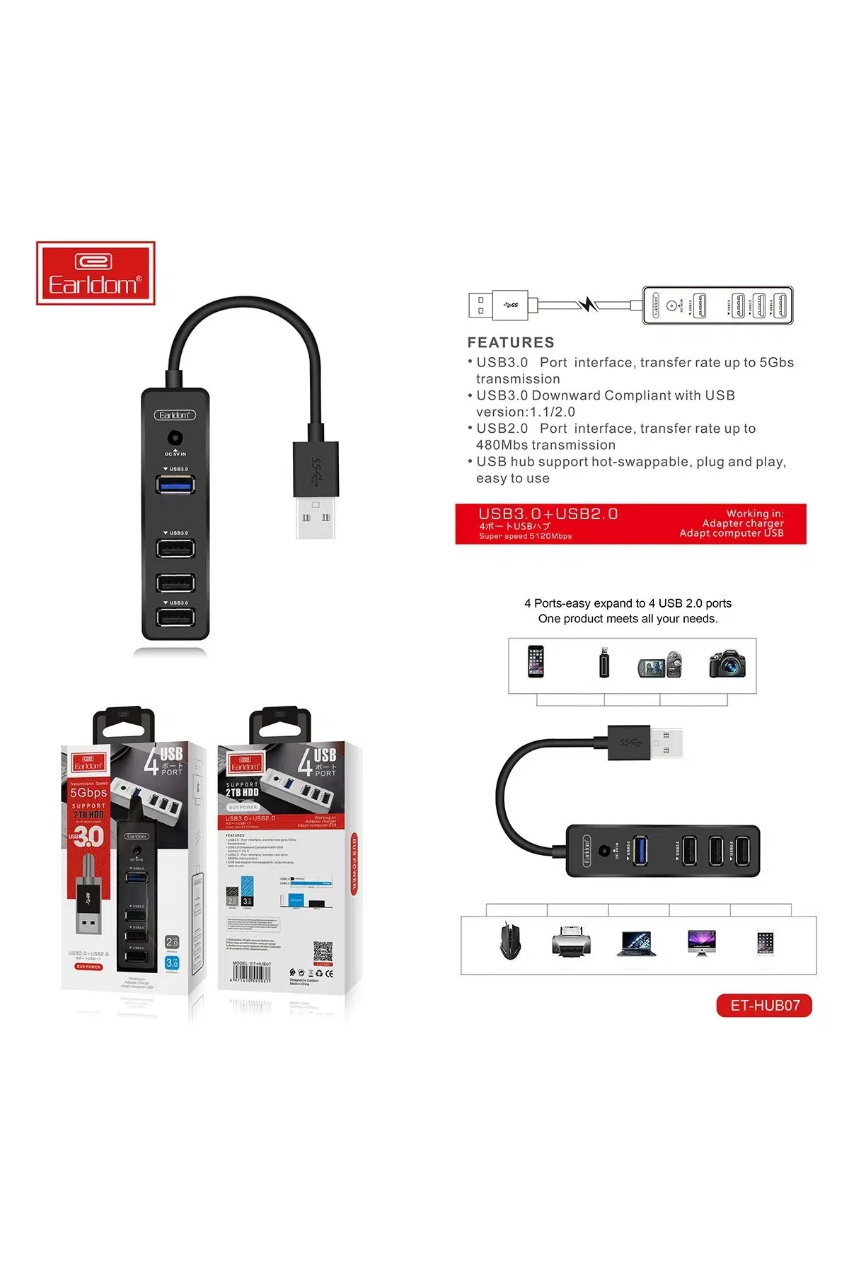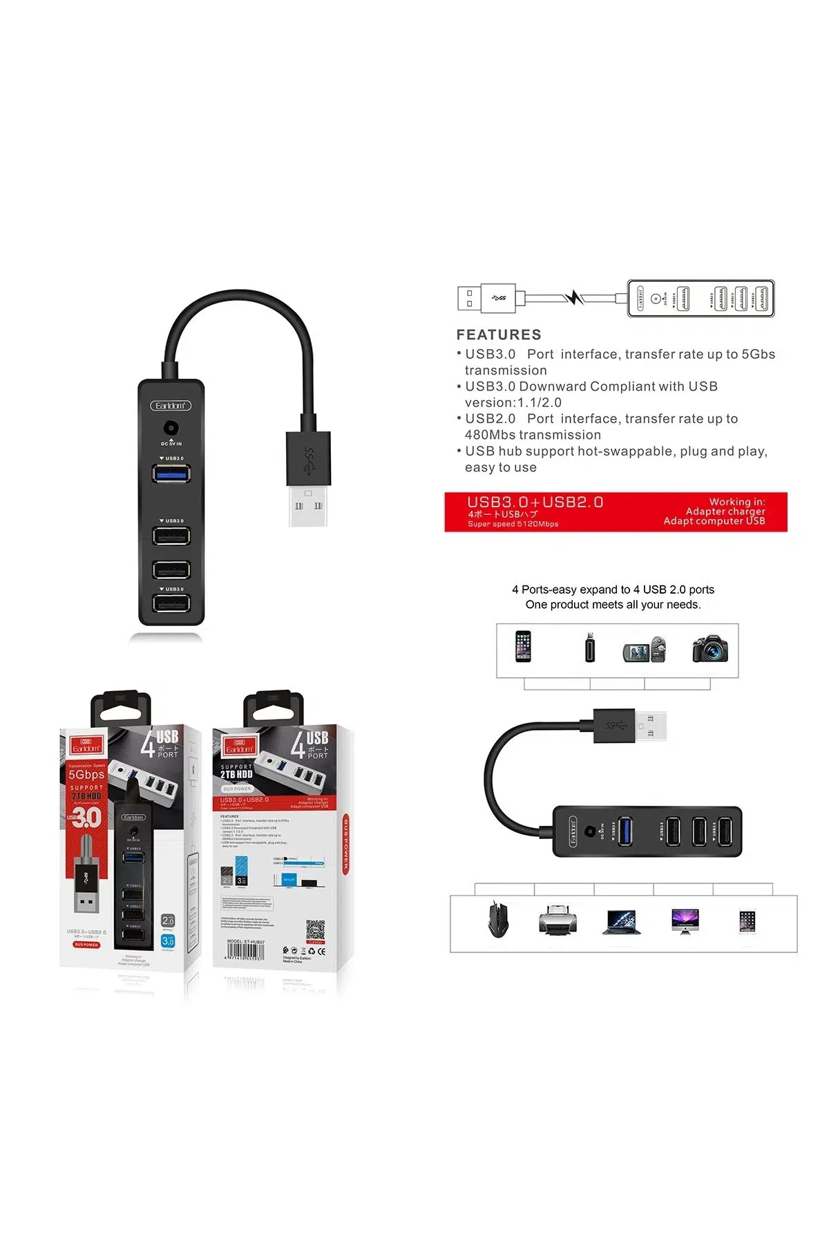 1.Fonksiyon: 4 in 1 USB OTG HUB, Tak ve çalıştır, 1*USB 3.0 ve 3*USB2.0 portu. USB destekli tüm cihazlarda kullanılabilir, PC/Tablet/Akıllı telefonlarda kullanılabilir, 1TB'dan büyük kapasiteye sahip harddisklerde kullanılmaz.