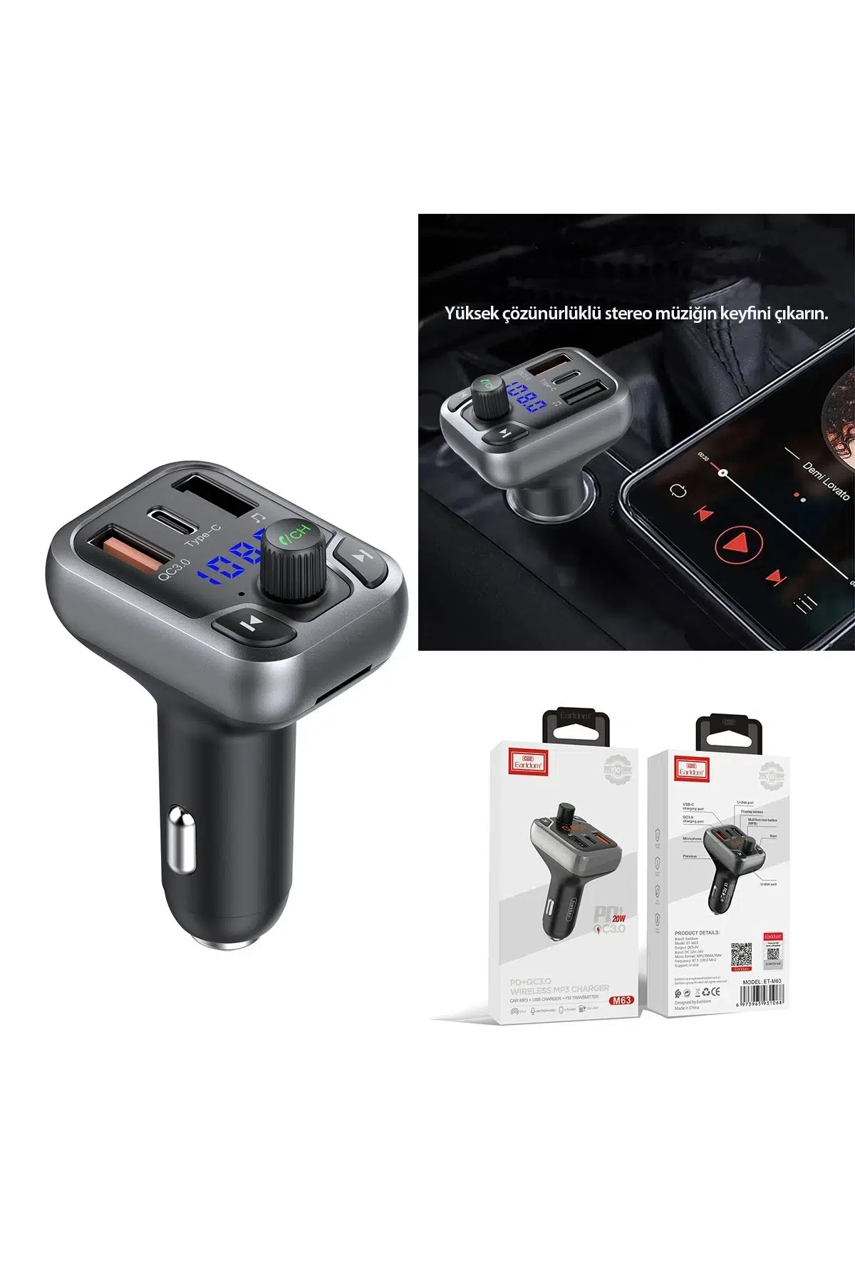 Earldom M63 FM Transmitter, Bluetooth 5.0 teknolojisi ve güçlü şarj desteği ile aracınızda hem müziğin hem de şarjın keyfini çıkarmanızı sağlar. USB 3.0 ve Type-C PD hızlı şarj çıkışları sayesinde aynı anda birden fazla cihazı hızlıca şarj edebilir. Eller serbest arama özelliği ile sürüş güvenliğini artırır, kolay bağlantı özellikleri sayesinde konforlu bir deneyim sunar.