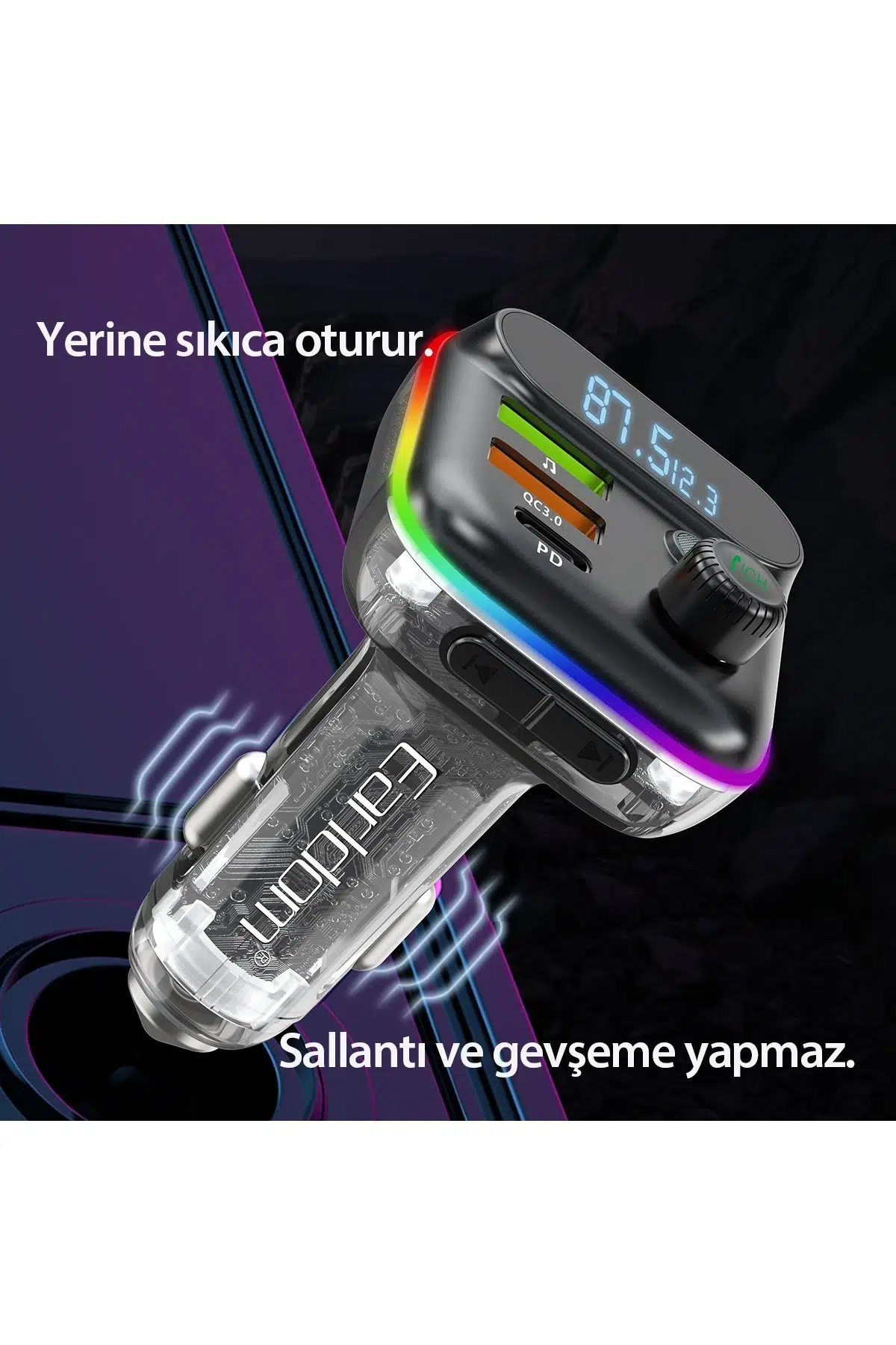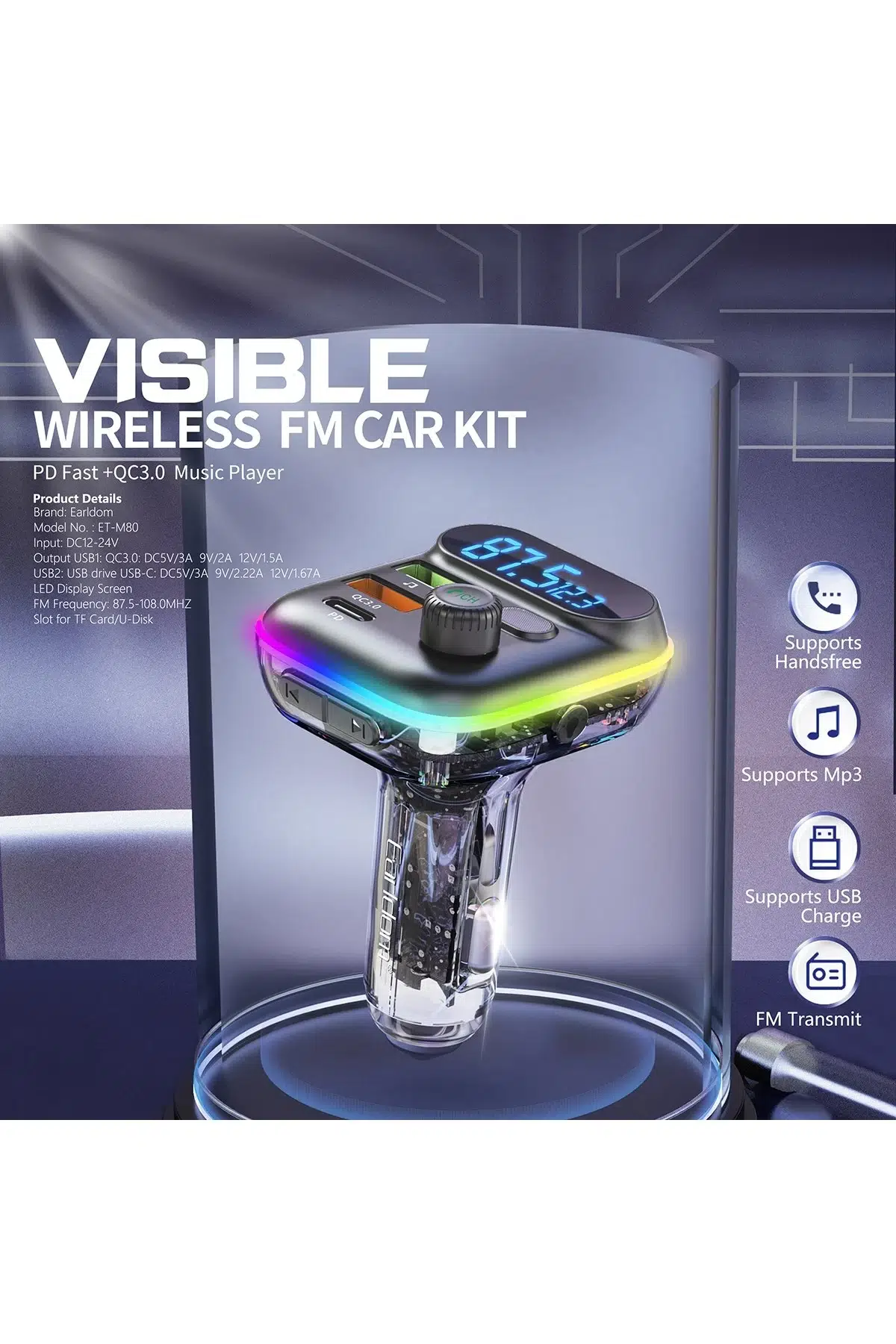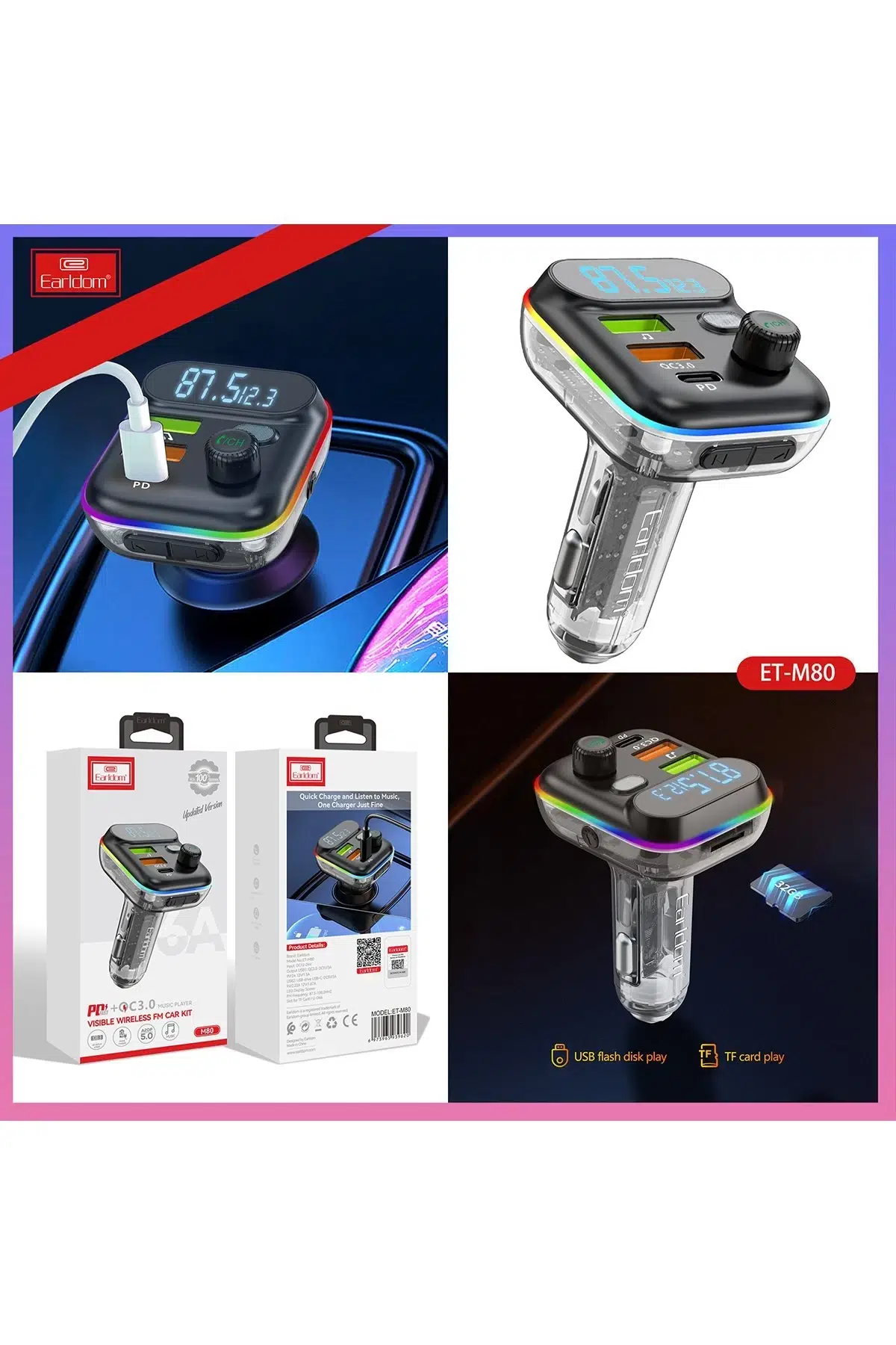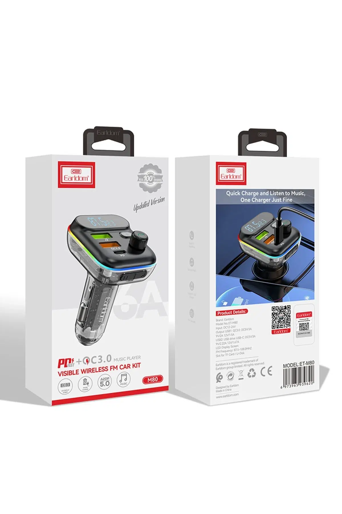 Earldom M80, hem müzik dinleme hem de hızlı şarj ihtiyaçlarınızı karşılamak için tasarlanmış çok fonksiyonlu bir FM transmitter'dır. Araç içi deneyiminizi geliştiren bu cihaz, modern teknolojiyi şık bir tasarımla bir araya getirir.