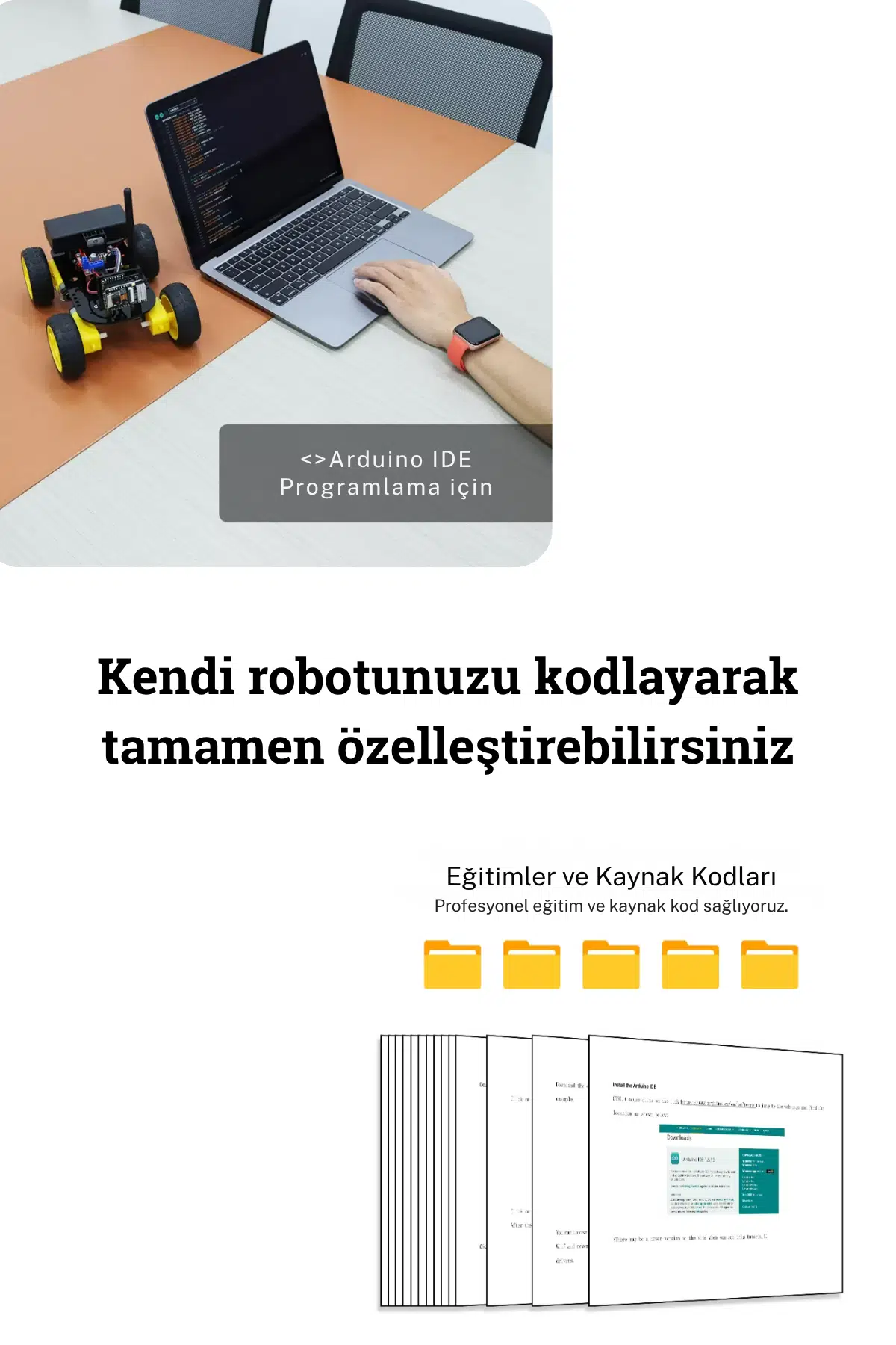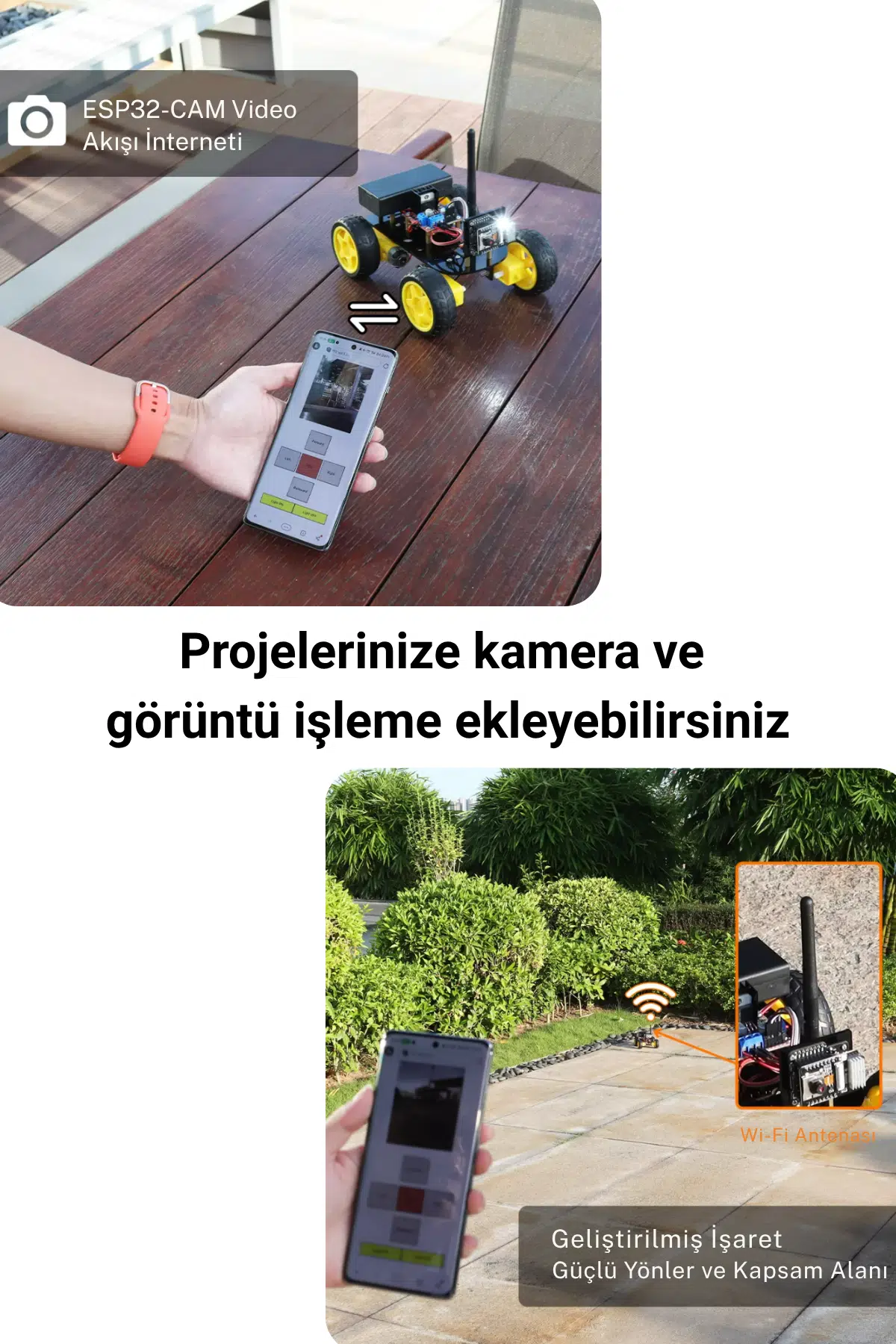Bu kit, Arduino uyumlu altyapı ve ESP32 işlem gücü ile donatılmıştır. Kamera entegrasyonu sayesinde sadece bir robot değil, aynı zamanda canlı görüntü aktarımı yapabilen akıllı bir sistem sunar.