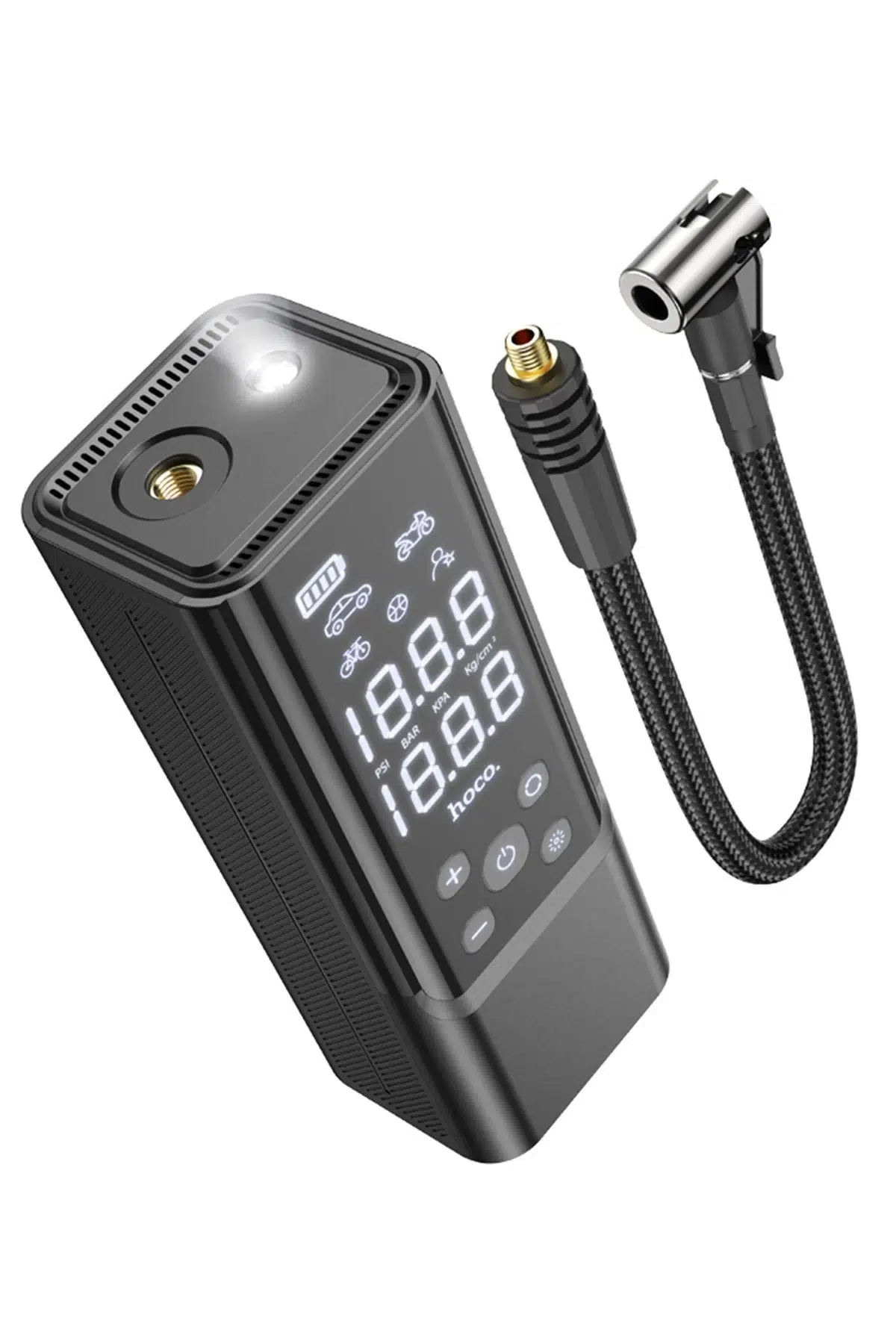 LED dijital ekran sayesinde şişirme basıncını kolayca takip edebilir ve 4 farklı moddan birini seçebilirsiniz: araç lastikleri, motosiklet lastikleri, bisiklet lastikleri ve spor topları. Basınç ölçüm birimleri arasında (PSI, BAR, KPA, Kg/cm²) geçiş yapabilirsiniz.