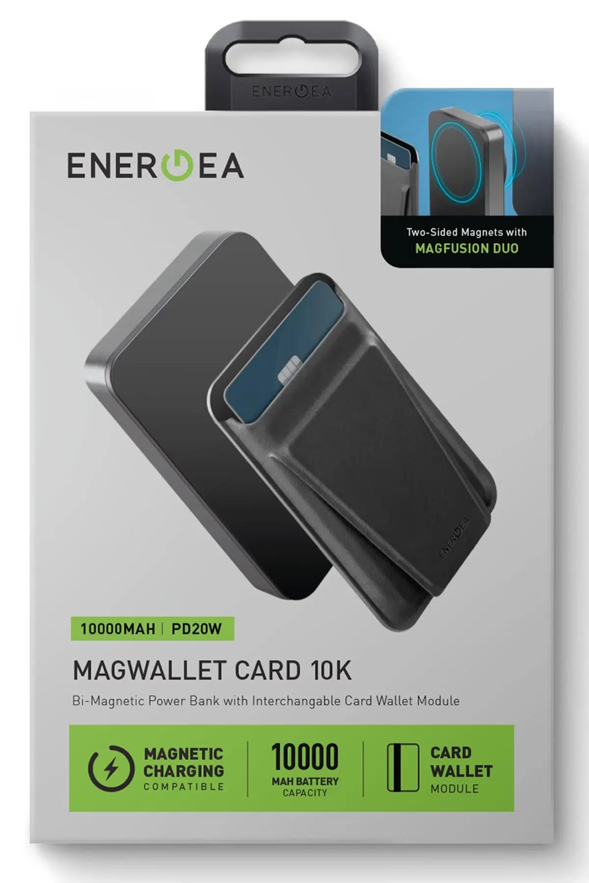 Energea MagWallet Card 10K 20W Type-C ve 15W Kablosuz Şarj Çıkışlı Ekstra Stant Özellikli Magsafe Kartlıklı PD Hızlı Şarj Magsafe Powerbank