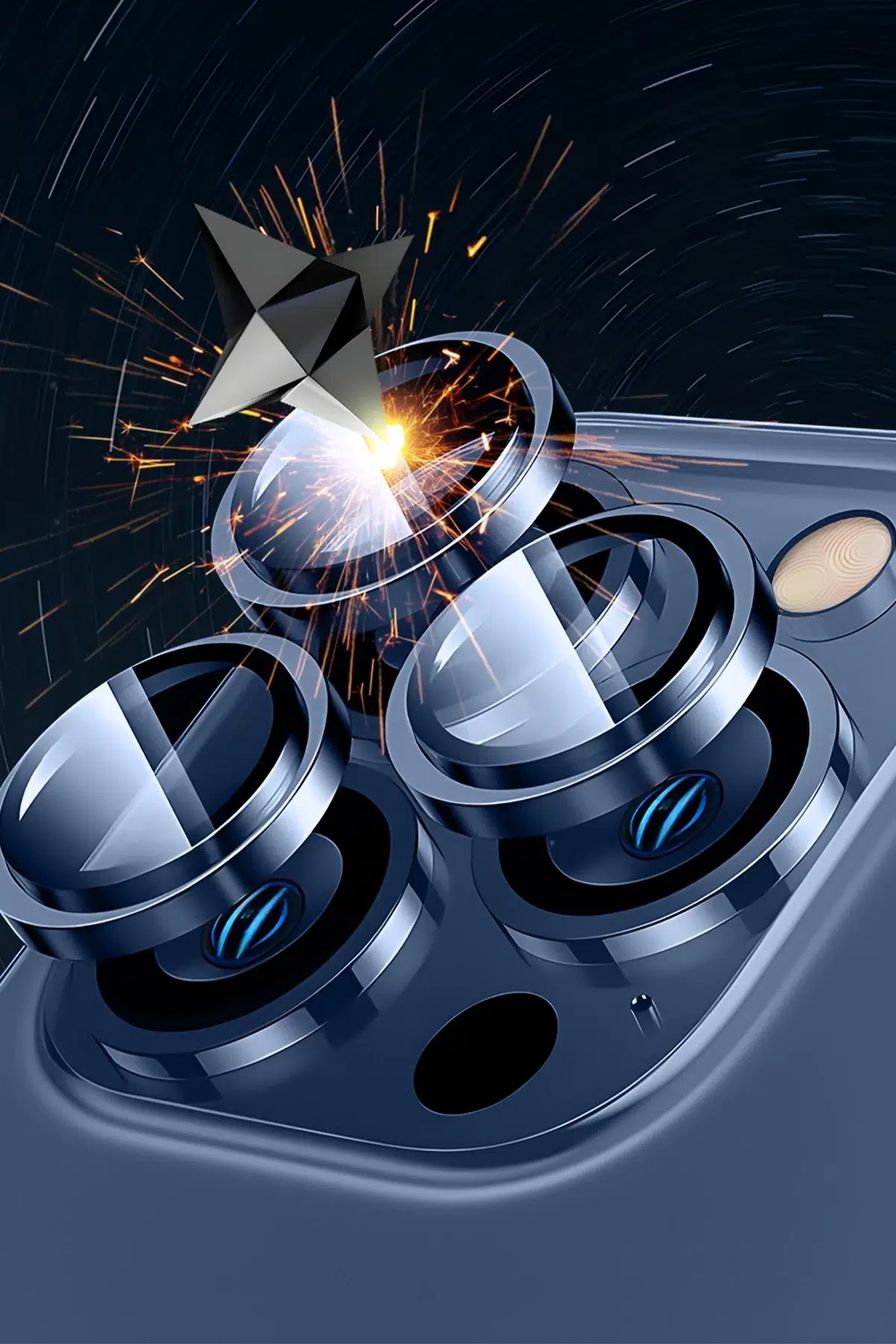 Sapphire PVDSS Kamera Lens Koruyucu, safir kristal dayanıklılığı ve PVD kaplama teknolojisi ile lensinizi en yüksek seviyede korurken, optik netliği ve şeffaflığıyla çekimlerinizin kalitesini korur.