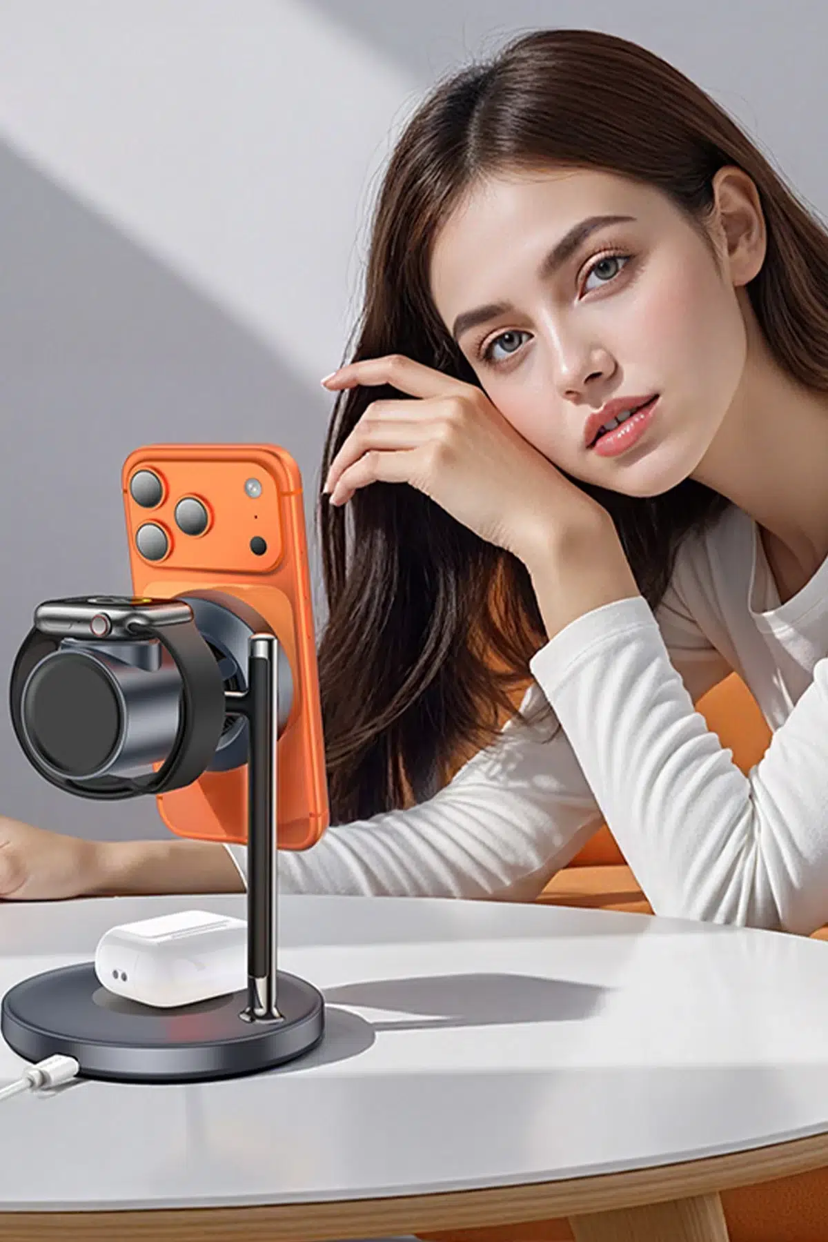 2-si-1 Tasarım (Şarj + Stand): Hem hızlı şarj cihazı hem de telefon standı olarak kullanılabilen pratik ve modern tasarım..