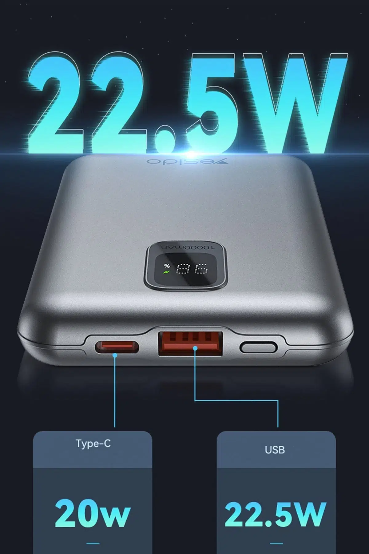 Yesido YP46 10.000 mAh 22.5W Dijital Göstergeli USB3.0 PD Hızlı Şarj Powerbank