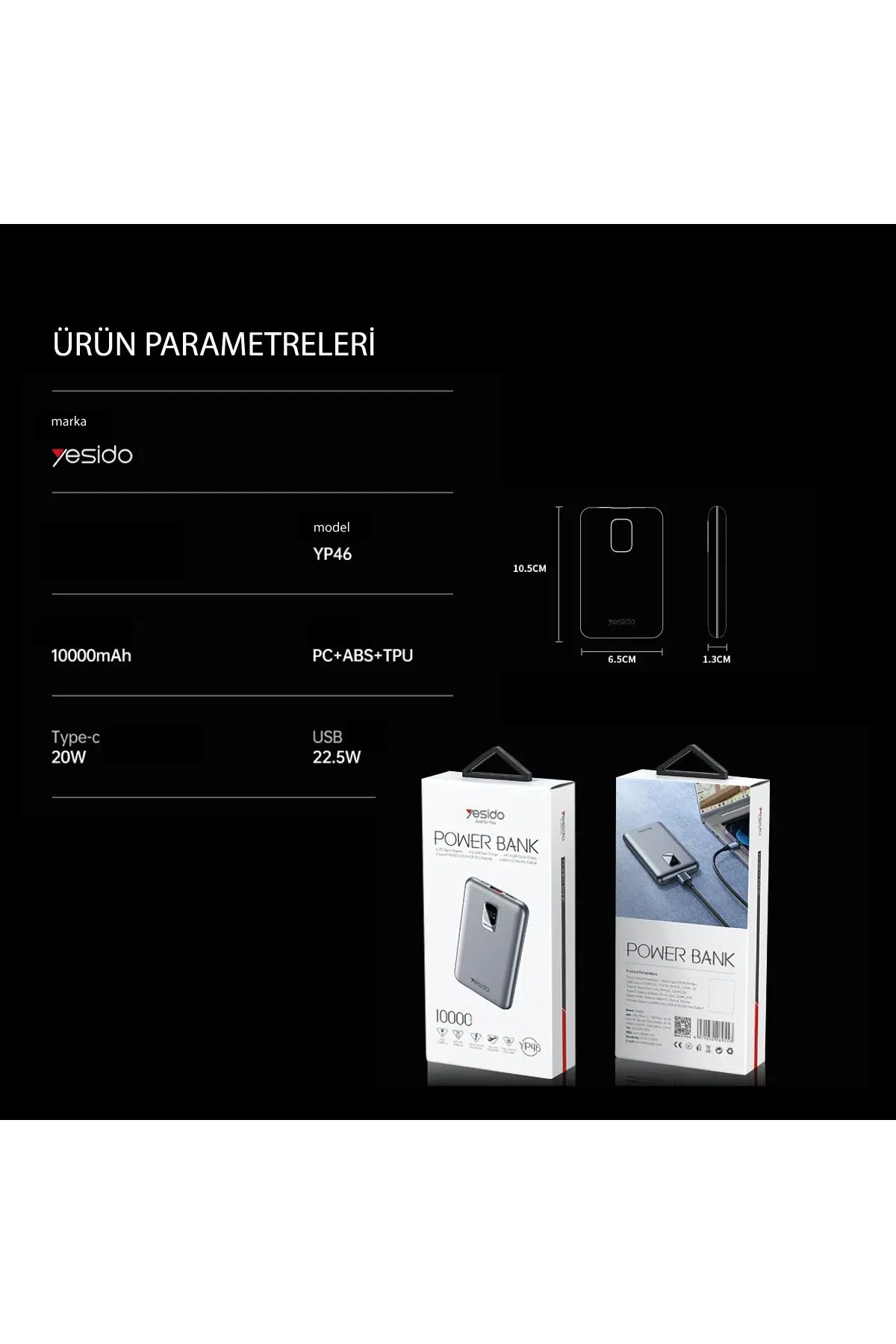 Siyah renkli şık tasarımı ile Yesido YP46, hem estetik hem de fonksiyonel bir powerbank sunar. Kompakt boyutu sayesinde çantanızda veya cebinizde kolayca taşıyabilirsiniz, böylece ihtiyaç duyduğunuz her an yanınızda olabilir.