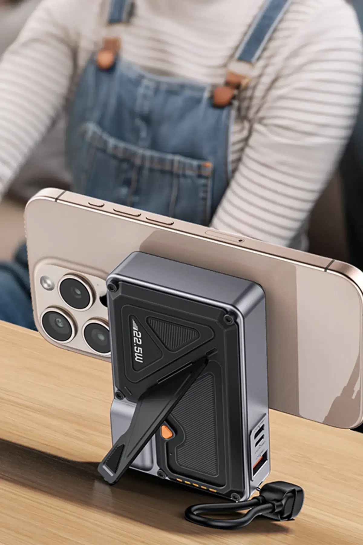 Dahili stand ve manyetik kablosuz şarj özelliği sayesinde telefonunuzu yatay konumda kullanabilir, video izleyebilir veya görüntülü görüşmeler yaparken şarj edebilirsiniz.